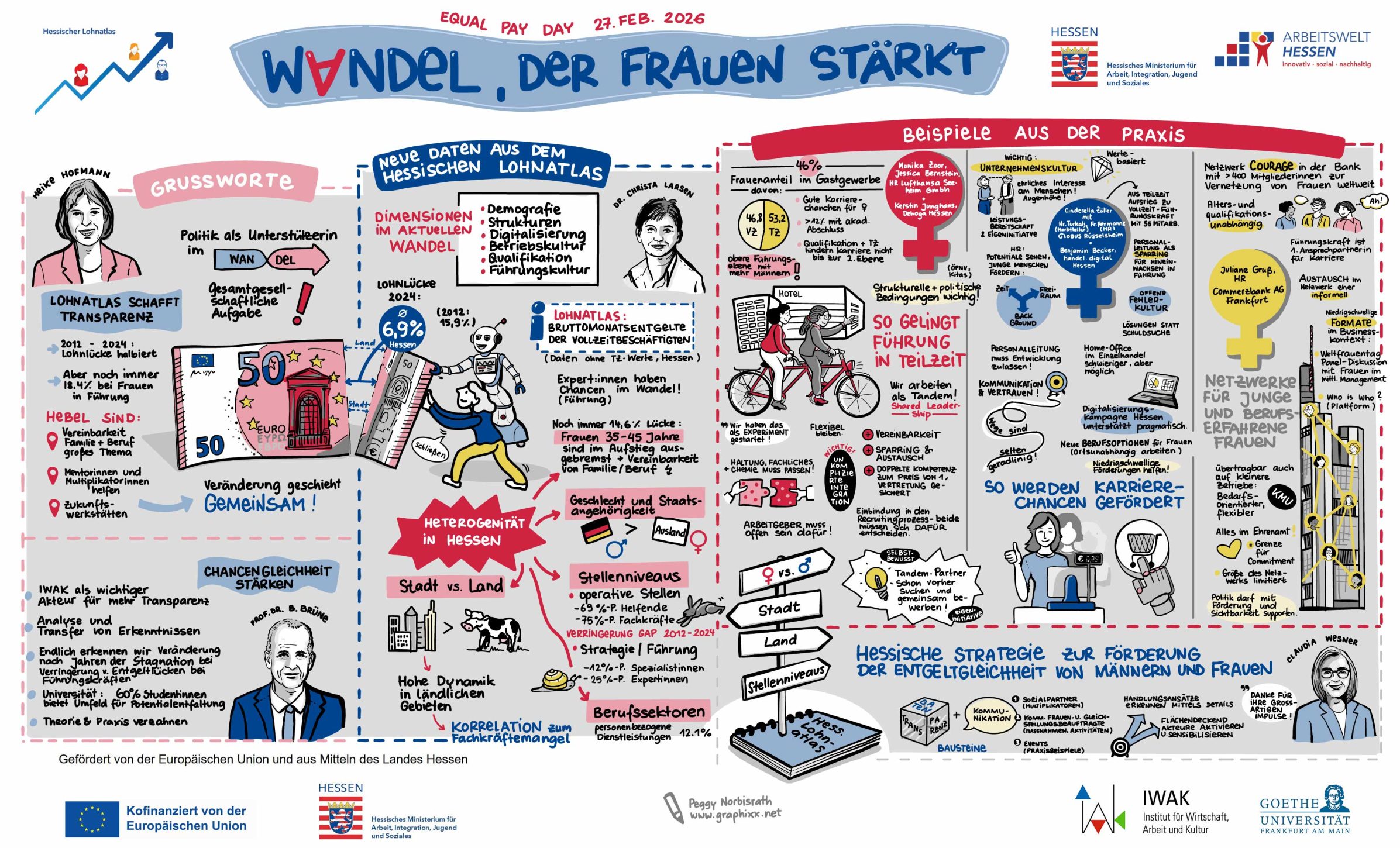 Die diesjährige Veranstaltung zum Equal Pay Day stand unter dem Motto „Wandel, der Frauen stärkt“. Neben Ergebnissen aus dem Hessischen Lohnatlas wurden Beispiele aus unterschiedlichen Branchen zur Frage präsentiert, welche betrieblichen Strukturen und Kulturen Frauen beim Aufstieg helfen können.